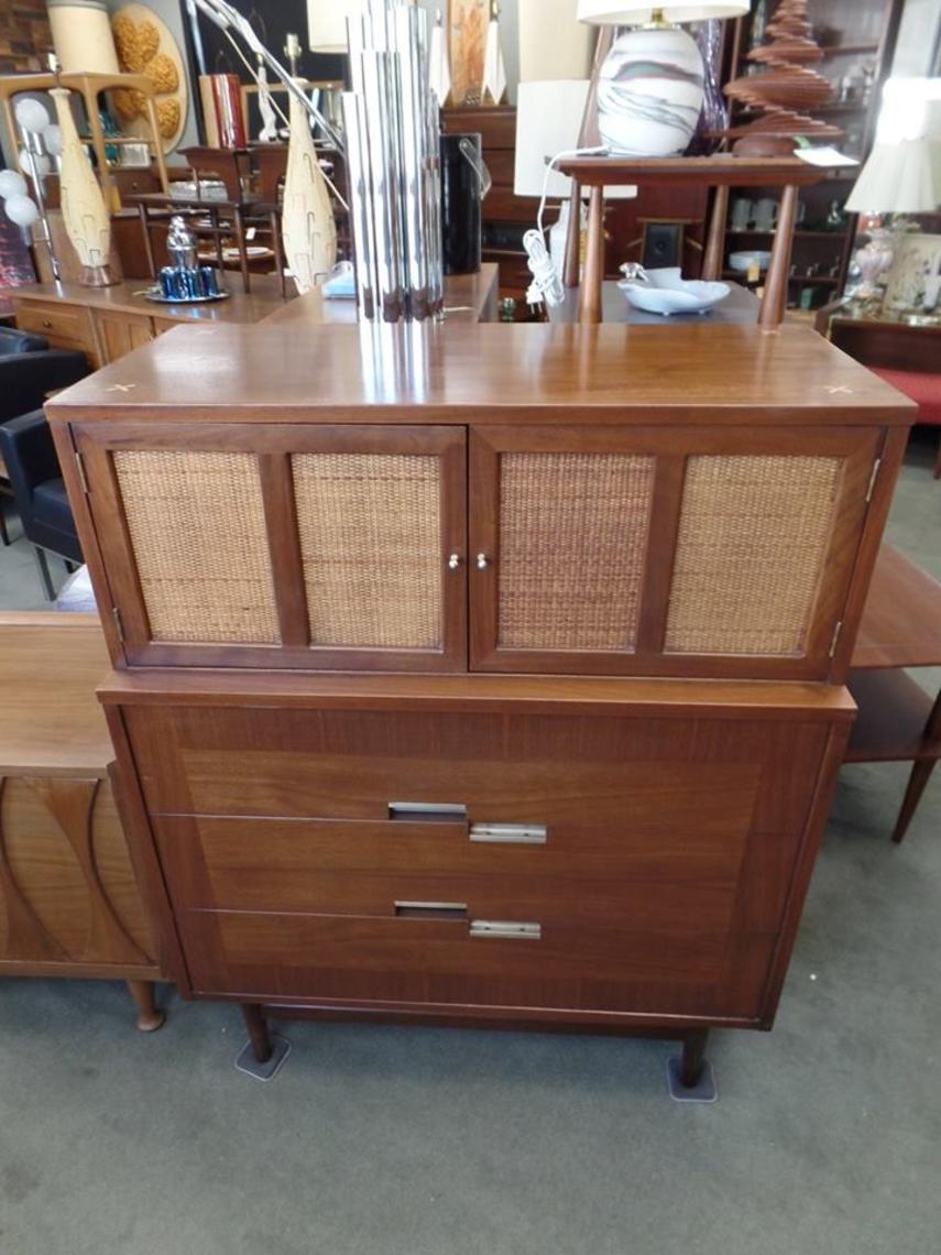 Mid Century Modern Highboy Dresser With Pewter And Cane Accents