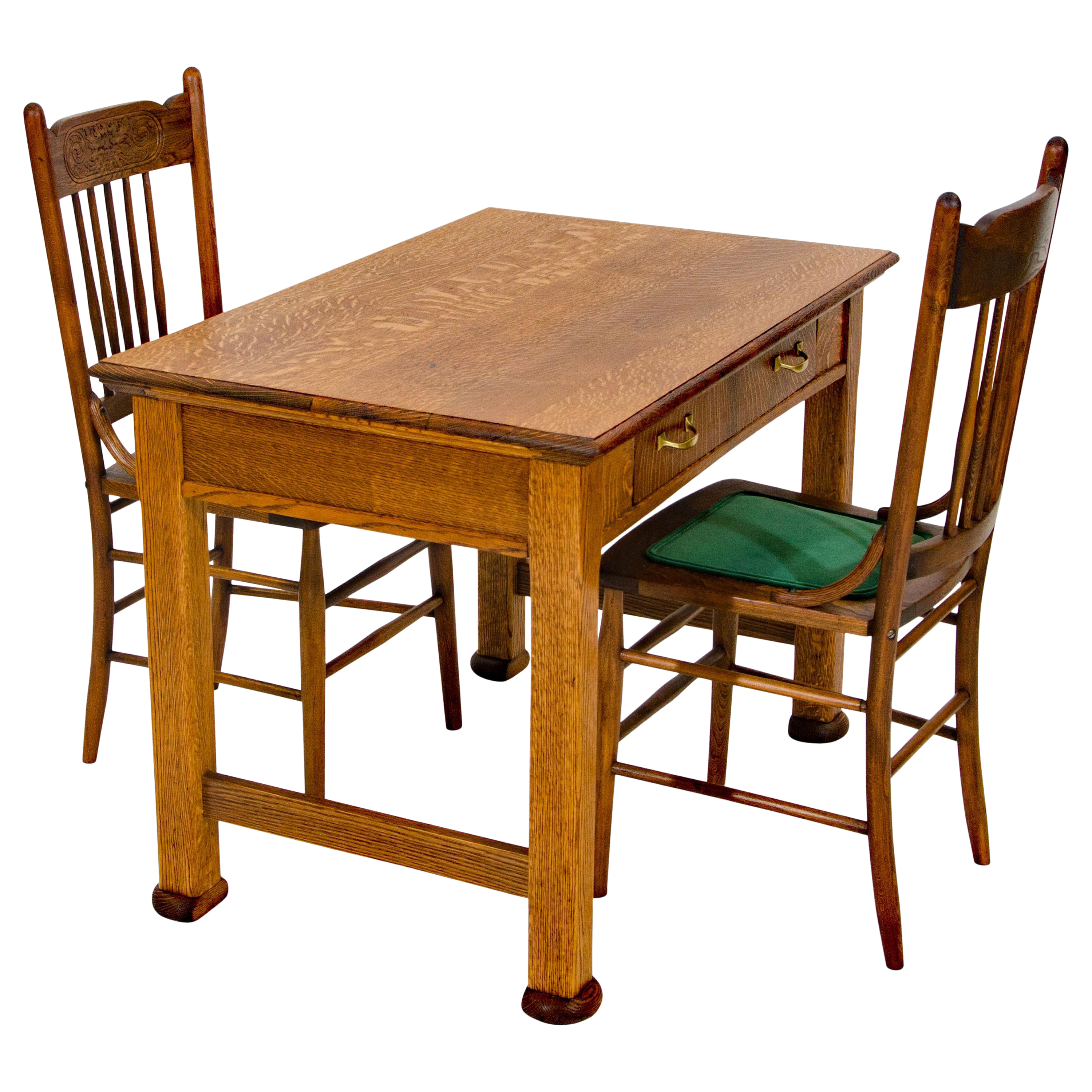 Antique Oak Desk Breakfast Or Library Table And Two Chairs