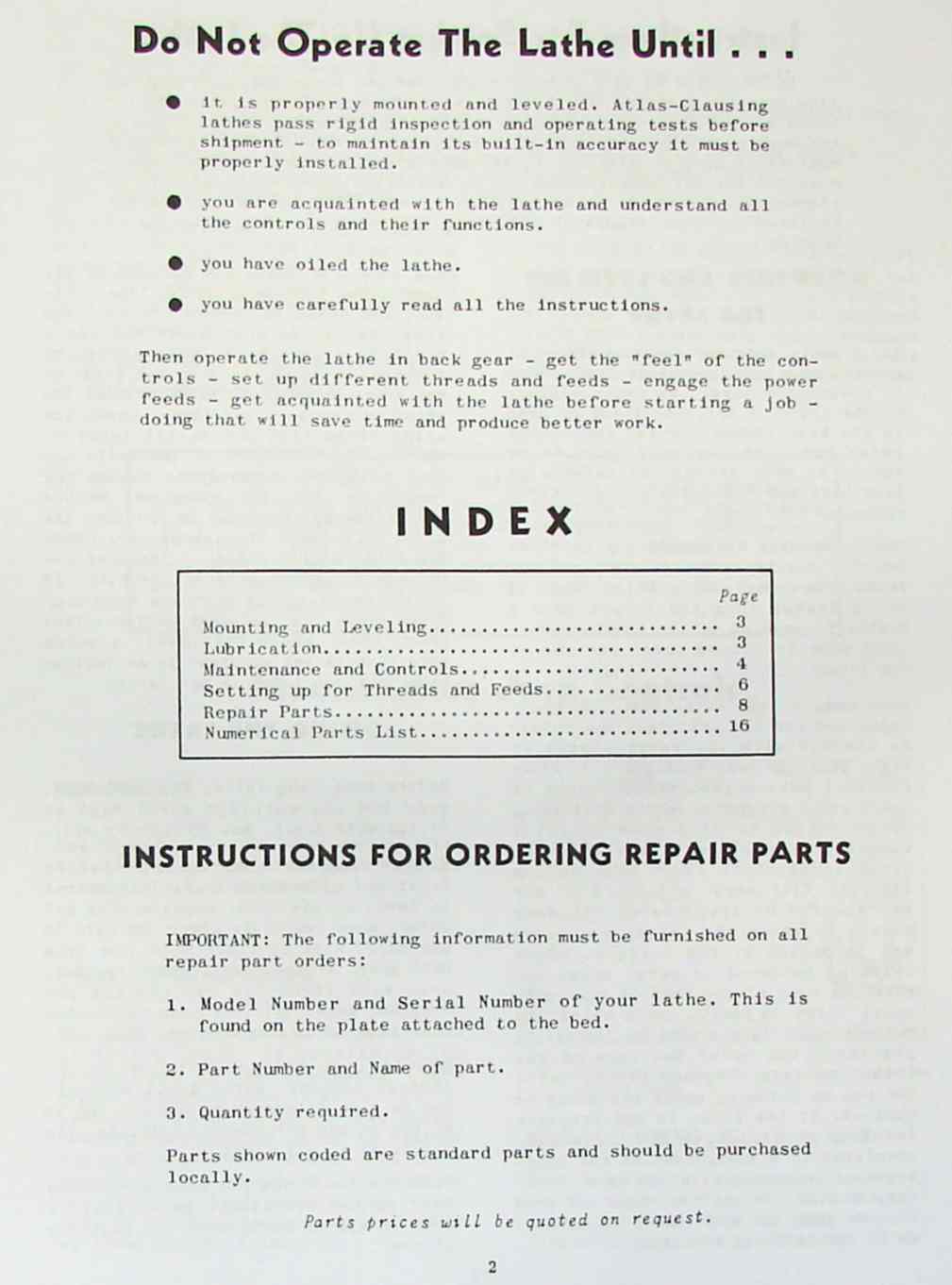 Clausing Atlas 12 6300 Series Lathe Operating Parts Manual