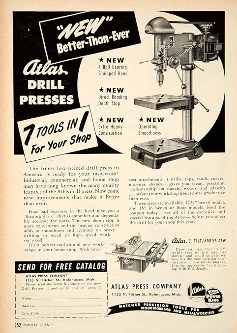 1949 Ad Atlas Drill Press Kalamazoo Michigan Tilt Arbor