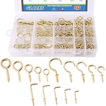 A selection of screw eyes screw hooks l hooks and vine eyes. 12x00 14x1 16x1 20x2 25x4 30x6 brass screw eyes eye hooks picture frame hanging. Suitable for use in interior and exterior applications. Used mostly in decorative and electrical applications.