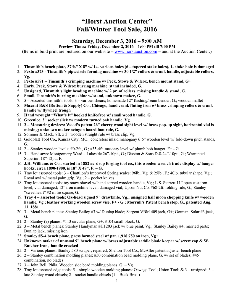 February 8 2020 Tool Auction Horst Auctioneers