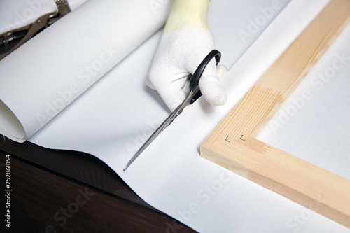 Scissors Cutting Canvas Wooden Stretcher Bar And A Male Hand In