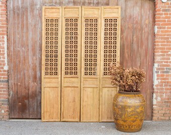1700 Chinese Lattice Folding Screen With 4 Panels And Carved Inserts