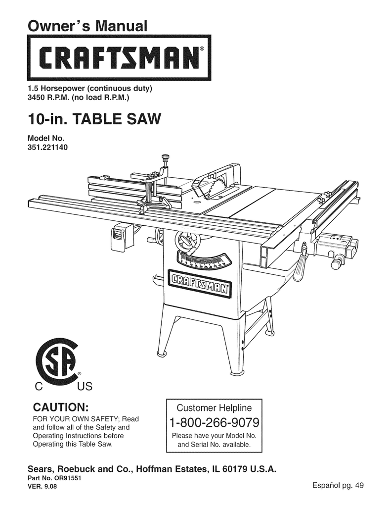 Craftsman 22124 Professional 10 In Table Saw Manuals