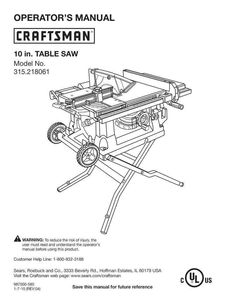 Craftsman 137218240 User Manual Table Saw Manuals And Guides L0408137