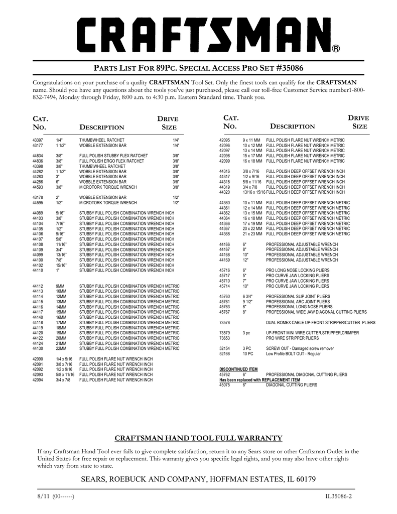 No Craftsman Hand Tool Full Warranty Sears Roebuck And Company