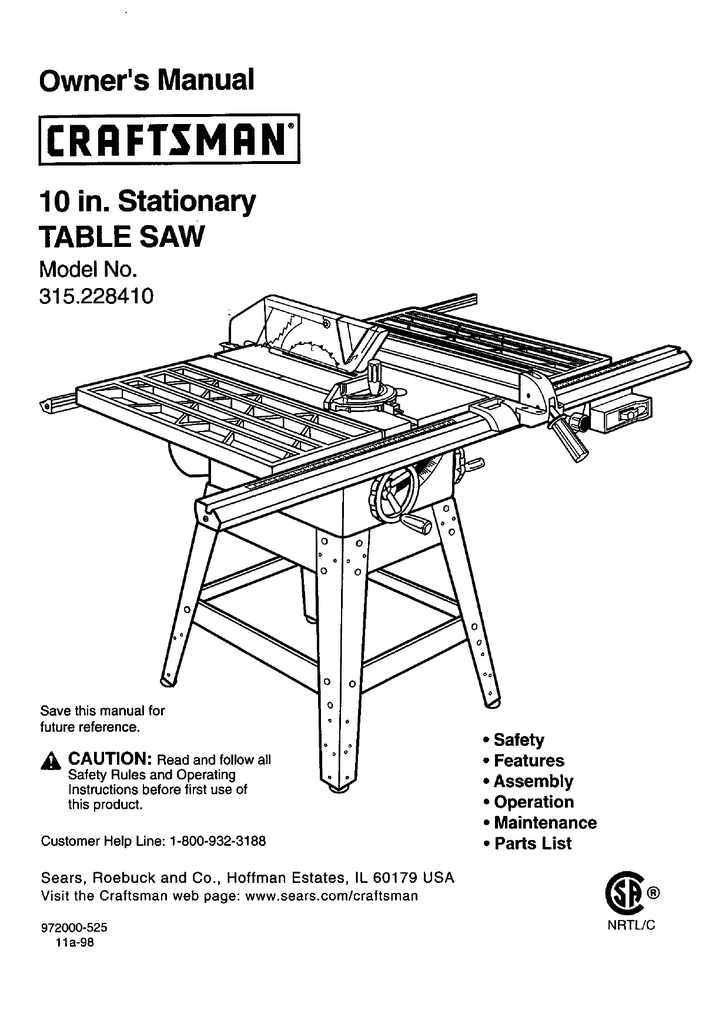 Craftsman 113298842 User Manual Table Saw Manuals And Guides L0803094