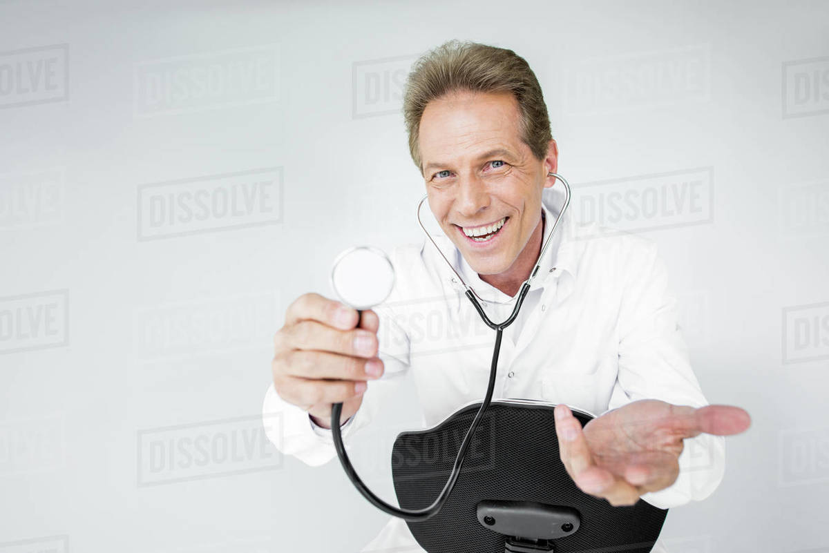 Cheerful Middle Aged Doctor Holding Stethoscope While Sitting On