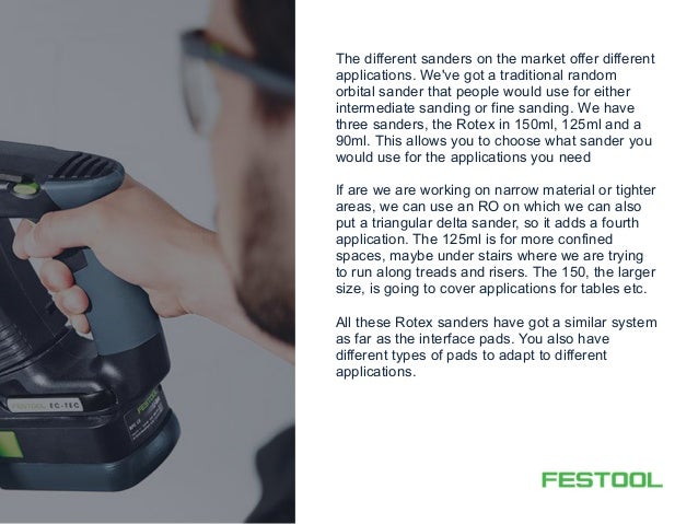 Review of two different festool sanders the ets 125 5 inch random orbital sander finish sander with vacuum and the rotex 125 dual purpose rotary and random orbital. Along with the sander i bought the festool 496149 stickfix sanding pad hard the festool 495188 auxiliary front handle for rotex ro 150 feq thefestool 497690 sys stf d150 abrasives systainer for 6in round abrasives sys 3 and an assortment of the sanding discs. Rotex was the very first geared eccentric sander and. This is the pinnacle of great design.