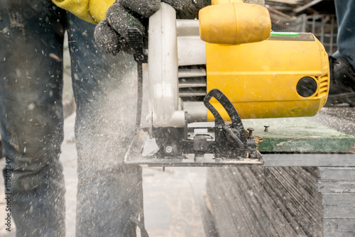 Carpenter Using Circular Saw For Cutting Wooden Boards