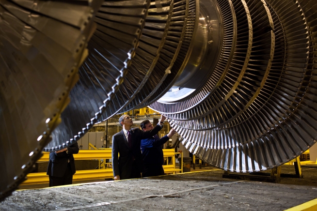 President Barack Obama Looks At A Turbine Rotor While Touring The
