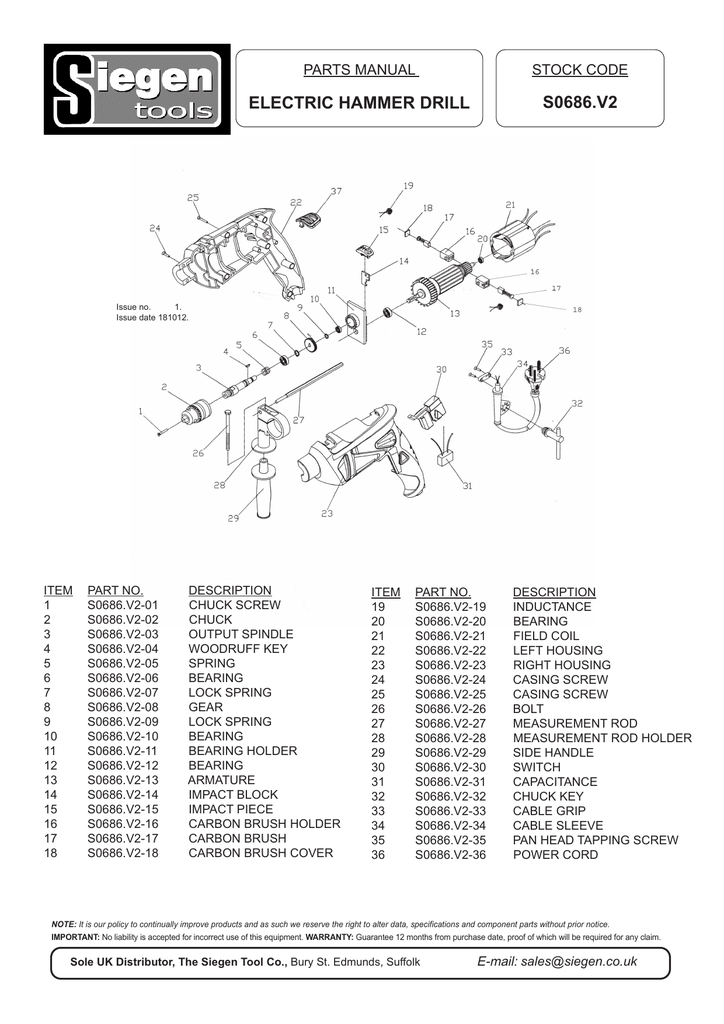 S0686 V2 Electric Hammer Drill Parts Manual Stock Code Manualzz