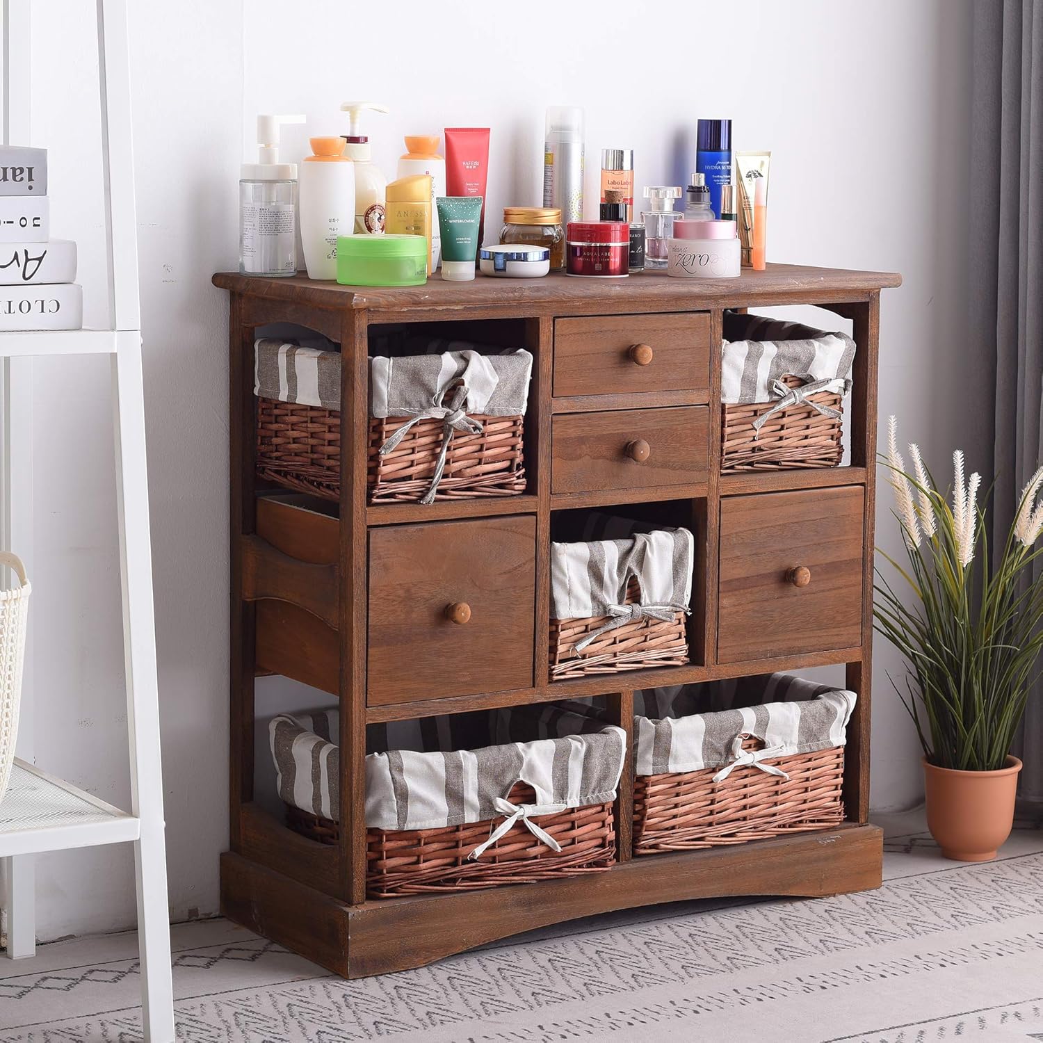 Rebecca Mobili Sideboard Cabinet 4 Wood Drawers 5 Wicker Baskets