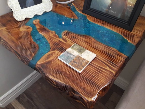 Hand Carved Raw Edge Wood Slab End Table Or Shelf Liquid Glass Etsy