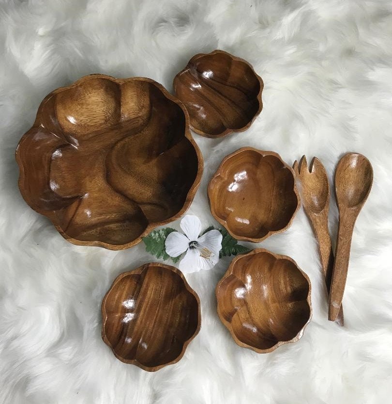 The large one is a leafy style then there are 2 smaller bowl types. 7 inch acacia wooden salad bowls aidea 4 acacia wood bowl set for cereal fruit pastahardwood serving best christmas gift 46 out of 5 stars 311 3199 31. The natural grain of these fine woods have their own unique design and color. Set of four wooden monkey pod salad bowls dark wood.
