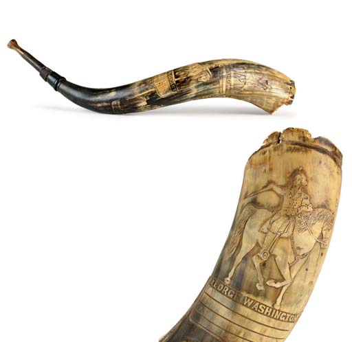 A Scrimshaw Powder Horn American 19th Century Sculptures