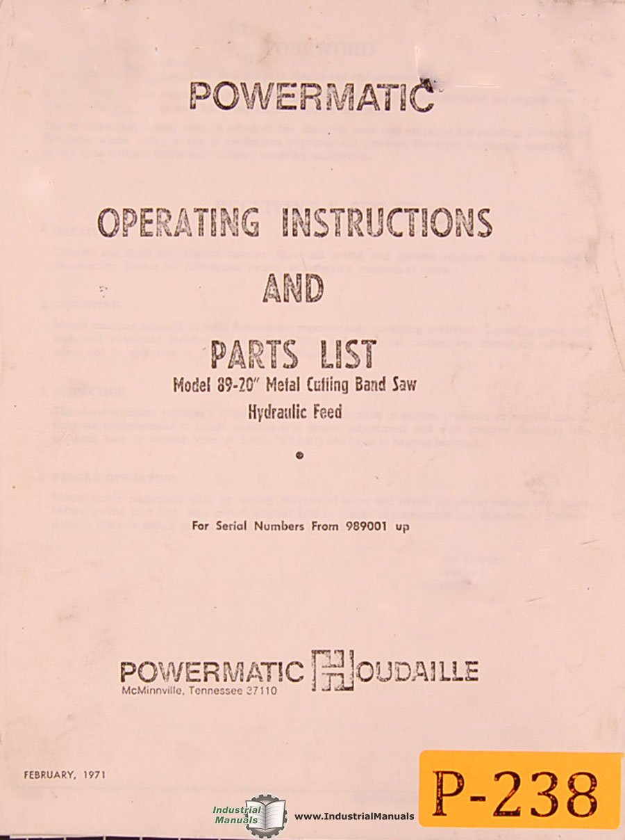 Powermatic Model 89 20 Band Saw Operations And Parts Manual