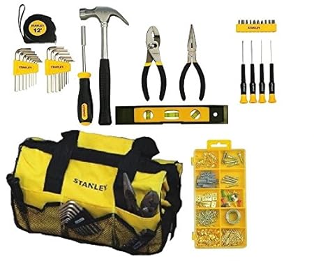 Stanley 65 piece tool kit. The kit contains a hammer measuring tape utility knife level two sets of pliers a standard and phillips screwdriver two sets of hex keys a inch round head ratchet eight inch sockets a inch spinner handle a inch bit handle and 30 bits. Pliers wrenches sockets screwdrivers level hammer and tape measure are sure to come in handy when you need to make quick fixes assemble furniture or mount wall decor. This doesnt fit the vehicle based on the information you provided. The stanley 94 248 65 piece homeowners diy tool kit is a must have tool set with everything you need to tackle a variety of tasks around the house.