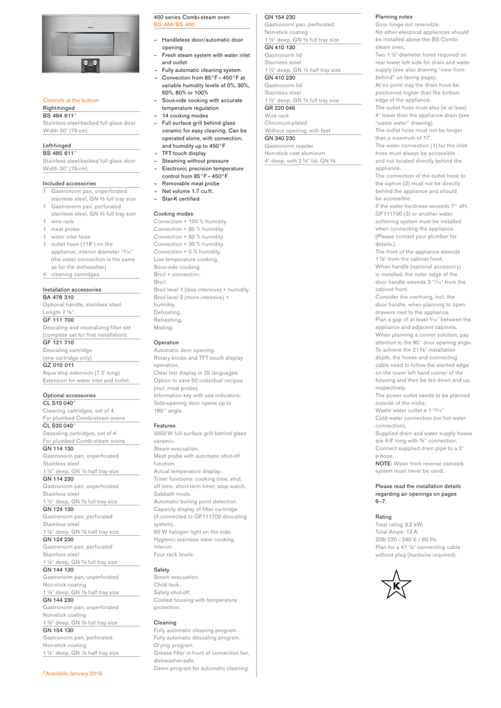 B S 484 B S 485 Gn 154 230 400 Series Combi Steam Oven Manualzz
