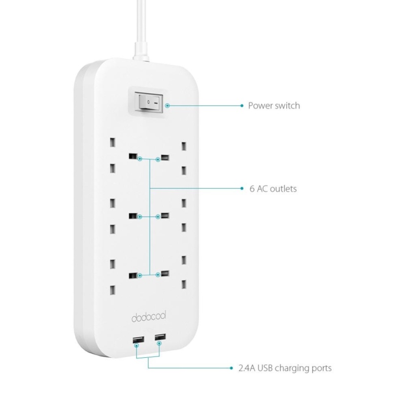 Dodocool Smart 6 Way Ac Outlet Power Strip With 5v 2 4a 2 Port Usb