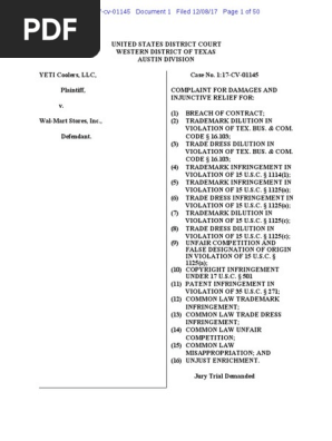 Yeti Coolers V Walmart Complaint Trade Dress Trademark